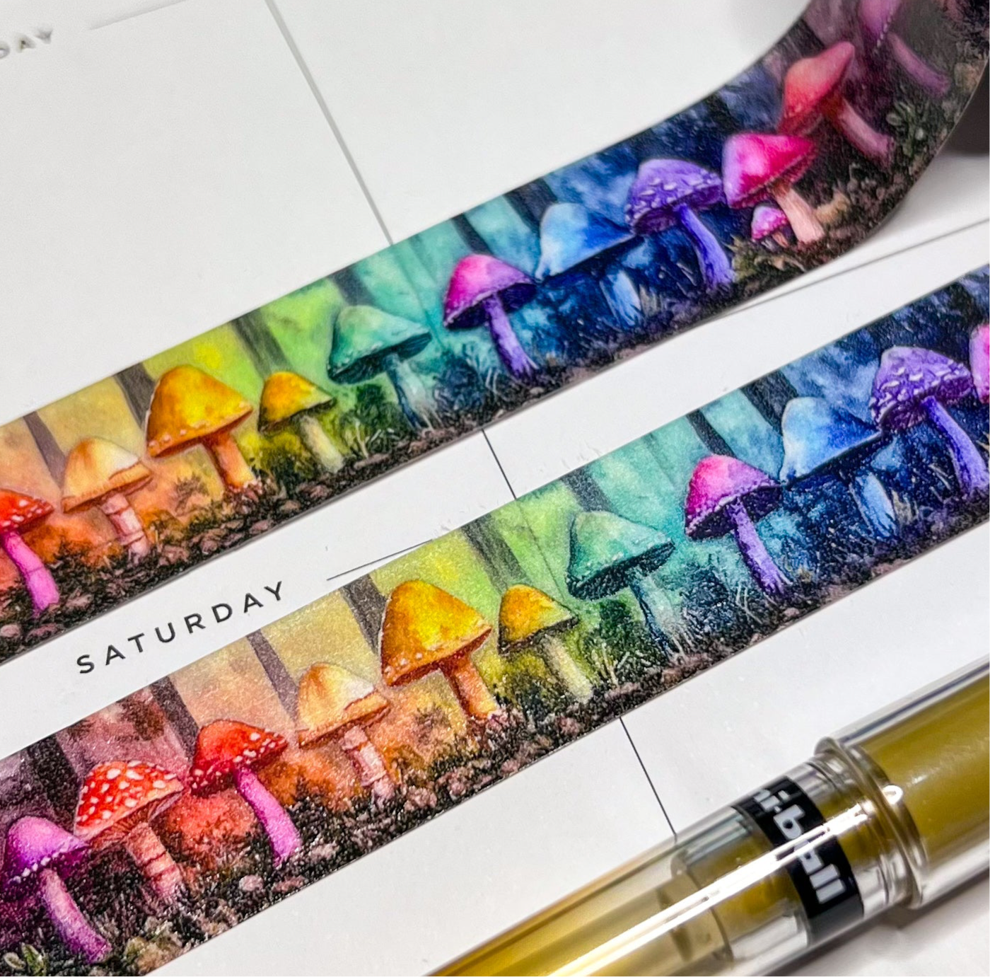 Set of 2 Magical Rainbow Mushrooms, Watercolor Landscape Art Washi Tape, Size 2.5cm Wide by 10m Long