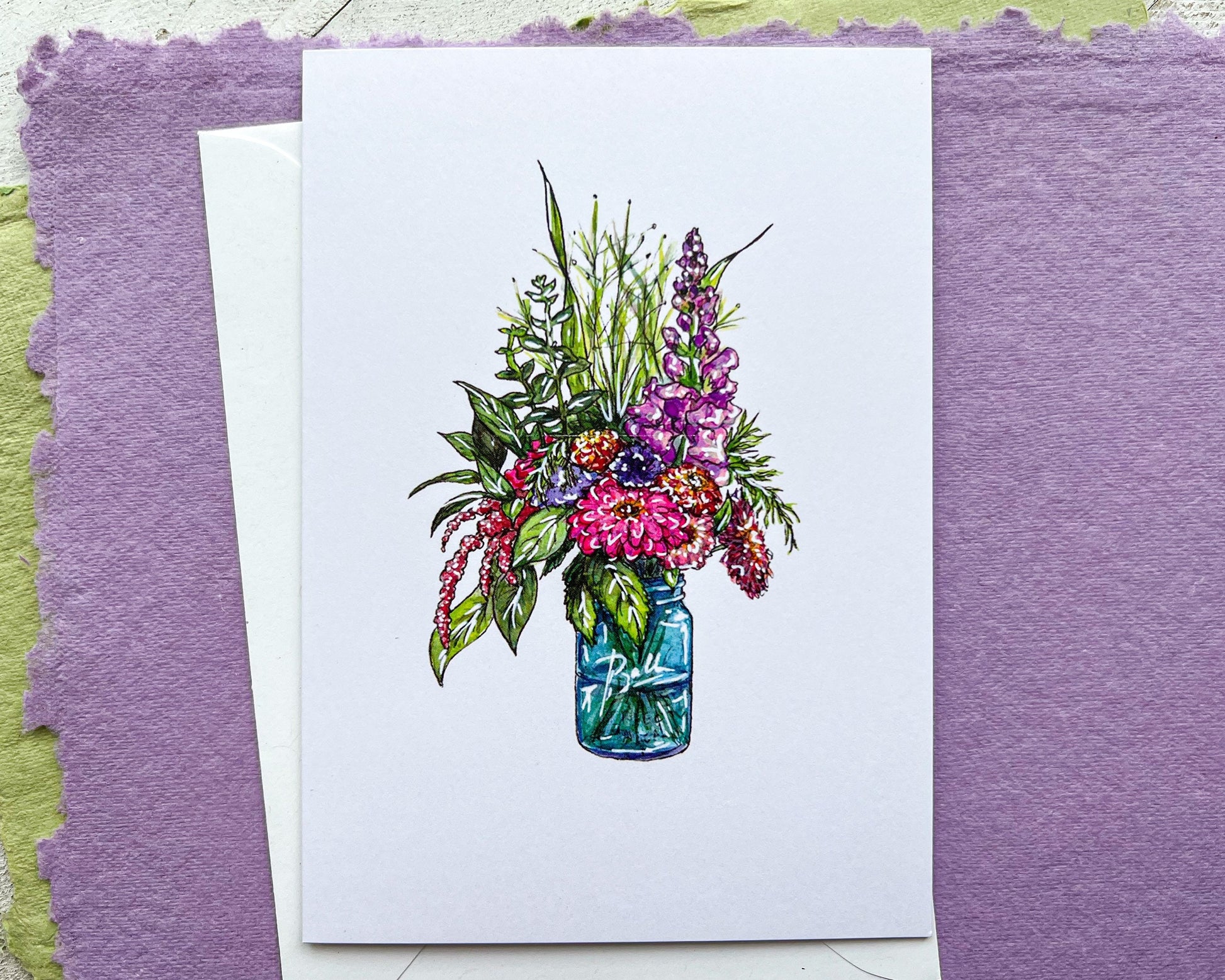 This greeting card features a watercolor illustration of a bouquet of fresh farm Flowers in a blue mason jar. This print is inspired by one of my original watercolor paintings.